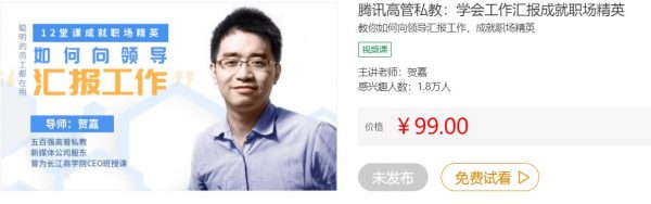 本套课程腾讯高管私教:学会工作汇报成就职场精英,课程官方售价99元,由五百强高管私教,长江商学院CEO班演讲教练贺嘉老师主讲,课程共分为12讲,文件大小共计1.55G。职场上从来都不缺干活的员工,缺少的是聪明的员工;如果你想让自己的职业生涯发展的一帆风顺的话,就必须要学会汇报工作,让领导认可你,本套课程通过12堂课教你成为优秀的员工,文章底部附下载地址。
